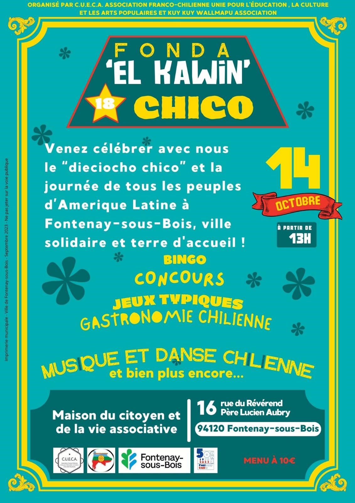 En partenariat avec l'Association Kuy kuy tun wallmapu et la Mairie de Fontenay sous-bois, la CuecAsso a organisé une "fonda". Ces espaces traditionnels chiliens sont un moment festif et intergénérationnel où nombreuses dimensions de la culture chilienne s'expriment au même temps : la tradition culinaire (avec son charquican, empanas et douceurs du Chili), la musique avec la participation del Chino y la China, Belén et Amanda, cuequeras de Barcelone, la danse avec une initiation à la cueca et la piste de danse ouverte pour que tous et toutes participent ainsi que des nombreux jeux traditionnels.