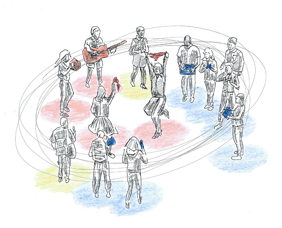 Suivant la tradition populaire de la Chilena, ce moment festif est dédié à l'interprétation collective de la musique, de la poésie, du chant et de la danse. Ici, les artistes sont le public invité, elles et ils sont amenés à créer un show échange improvisé, participatif et inclusif. Pas besoin d'être un professionnel-le, les amateur-rice-s et les débutant-e-s sont ainsi initiés aux divers chemins de la cueca les bienvenus. Chaque participant-e de la Rueda contribue à créer une atmosphère festive par le biais de grâce à la danse, la poésie, la musique, le chant, l'accompagnement avec les mains applaudissements et toute pratique artistique liée à l'expression populaire chilienne. dans le cadre de la fête chilienne.